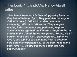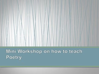 The document discusses poetry and provides examples of different types of poetry. It defines poetry as a form of literature written in a rhythmic style using verse. It then explains different poetic elements such as lines, stanzas, rhyme schemes, and various stanza forms including couplets, triplets, quatrains, and more. The document also provides examples of different types of poetry like lyrical poetry, narrative poetry, concrete poetry, haikus, cinquains, acrostics, and Shakespearean sonnets. It discusses the purpose of poetry and how teachers can use model poems to guide students in writing their own poetry.