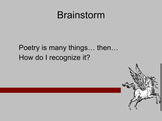 The document discusses different definitions and perspectives on what poetry is. It provides 7 definitions ranging from poetry being a form of art that conveys beauty and truth, to being a game that breaks conventional rules of language. It also includes two short poems as examples of poetry.