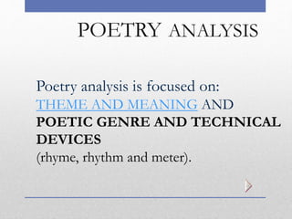 This document provides an overview of key concepts for analyzing poetry, including theme and meaning, imagery, symbolism, characterization, figurative language like simile and metaphor, technical structure involving rhyme, meter, and poetic forms. It defines different genres such as sonnets, epics, lyrics, and free verse. Imagery, symbolism, and figurative language are important for conveying themes. Meter and rhyme create rhythm and structure in poetry.