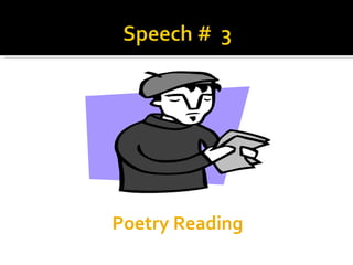 This document provides guidance on performing poetry through vocal delivery techniques including gestures, pitch, volume, pacing, pauses, enthusiasm, facial expressions, and emphasis. It instructs the reader to analyze 4 gestures for a poem, practice delivery with a partner twice, and think about which words to emphasize and how to show emotions through facial expressions to correspond with the meaning and tone of the poem.