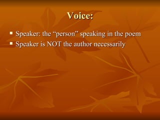 The document provides an introduction to analyzing song lyrics as poetry by defining several key literary terms and concepts. It discusses voice, tone, imagery, figures of speech like similes and metaphors, word choice, symbolism, sound techniques like rhythm and meter, and irony. Examples are given for many of the terms from the lyrics of various songs. The overall purpose is to familiarize readers with analyzing the poetic elements and techniques used in song lyrics.