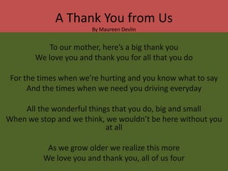 This poem is dedicated to the speaker's mother and what they learned from her about love and caring for others. The speaker learned from their mother how to care for others during difficult times, such as by bringing flowers or food to the hospital or for grieving families. The speaker learned the importance of attending viewings and funerals even if they did not know the deceased, in order to offer sympathy and support to the living. They learned that the small acts of kindness are what matter most during times of loss, not so much the words but showing up and offering help.