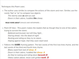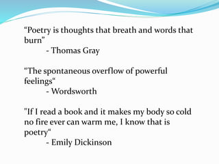 This document discusses various elements and poetic devices used in poetry, including form, lines, stanzas, rhyme, pattern, rhythm, and euphony. It provides definitions and examples of different forms of poetry, such as free verse, couplet, tercet, and blank verse. Rhythm is described as the pivotal element that creates a pleasant flow when reading poetry, influenced by factors like meter, feet, stressed and unstressed syllables. Common poetic feet include iamb, trochee, anapest and dactyl. Modern poetry often employs free verse without strict adherence to traditional meter or rhyme.