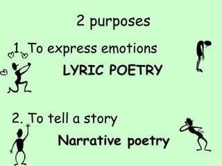 This document provides definitions and examples of various literary devices and poetic forms including: simile, metaphor, personification, repetition, hyperbole, idiom, refrain, symbolism, imagery, dialect, alliteration, assonance, onomatopoeia, oxymoron, pun, irony, and allusion. It also defines prose, poetry, meter, rhyme scheme, and provides examples of lyric poetry, narrative poetry, traditional poetry, free verse, diamante, haiku, cinquain, concrete poetry, limerick, and epitaph.