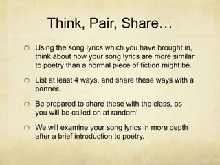 This document provides an introduction to poetry, including important terminology like diction, imagery, mood, and theme. It discusses tips for reading poetry like slowing down, multiple readings, and using SALTT (Speaker, Audience, Life message/Theme, Topics, Techniques). Poetic techniques are defined, including the use of lines, images, sound, rhythm, and creative density. Song lyrics are to be analyzed for how they are similar to poetry in their use of these elements.