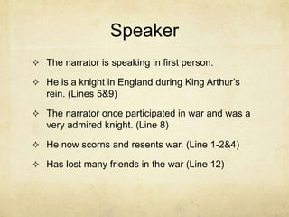 The poem describes a knight who once glorified and admired war but has now come to scorn and resent it. He recalls how he used to view knighthood and battle as bright and heroic exploits but has since lost friends in war and sees it as driven by lust, hatred, and senseless violence. The poem illustrates how one's perspective and opinion of institutions like war can change dramatically over time through first-hand experience and loss.