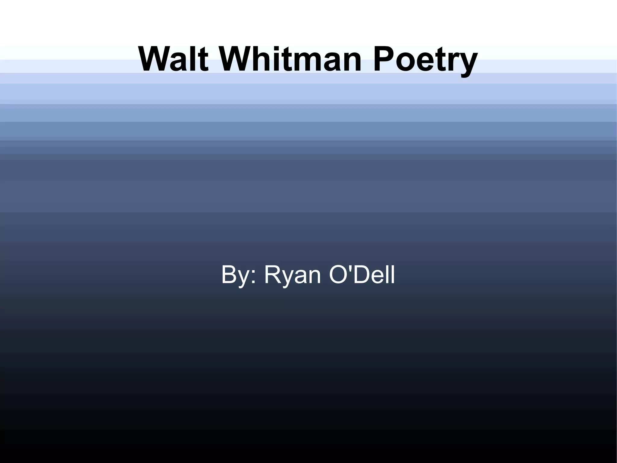 The document provides a summary of Walt Whitman's life and work. It includes brief biographical details, summaries of several of his poems, and short excerpts from the poems. The poems discussed cover various themes such as nature, death, love, companionship, and the meaning of life. They demonstrate Whitman's contemplative and insightful style of poetry.