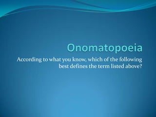 The document provides examples of different poetic terms and devices, including onomatopoeia, alliteration, haiku, hyperbole, and imagery. It tests the reader's understanding by presenting answer choices that could define each term and providing feedback on the correct responses.
