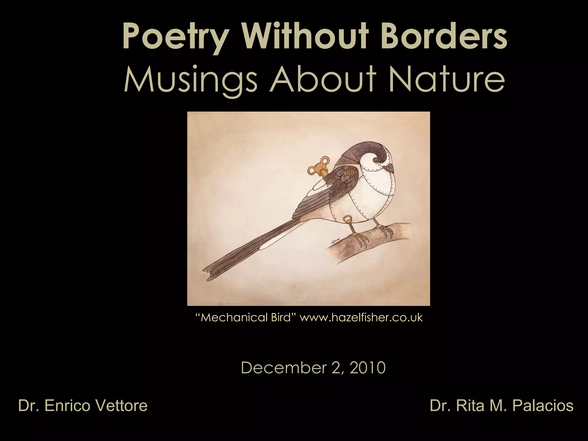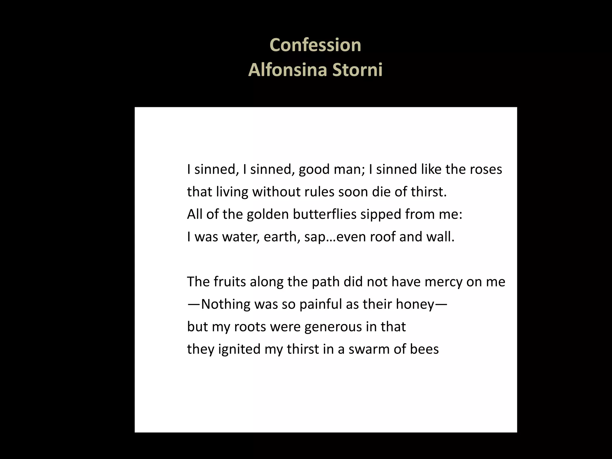 The document contains several poems in different languages and styles. It begins with "Confession" by Alfonsina Storni about sinning like roses that die of thirst. It then includes brief poems about wandering through mists by Hermann Hesse, the wide and sad land by Van Wyk Louw, and a shrub by Keven Sandoval. It concludes with Giacomo Leopardi's poem about a lonely sparrow watching other birds joyfully wheel through the sky while it gazes apart and consumes its life with plaintive music.
