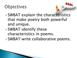 This document discusses the three characteristics that make poetry powerful: intensity, precision, and concision. It provides examples to illustrate each characteristic and examines poems to identify which characteristics they demonstrate. Students are tasked with analyzing poems to determine which of the three characteristics are evident in each one. The lesson concludes by challenging students to identify poetic language in everyday situations.