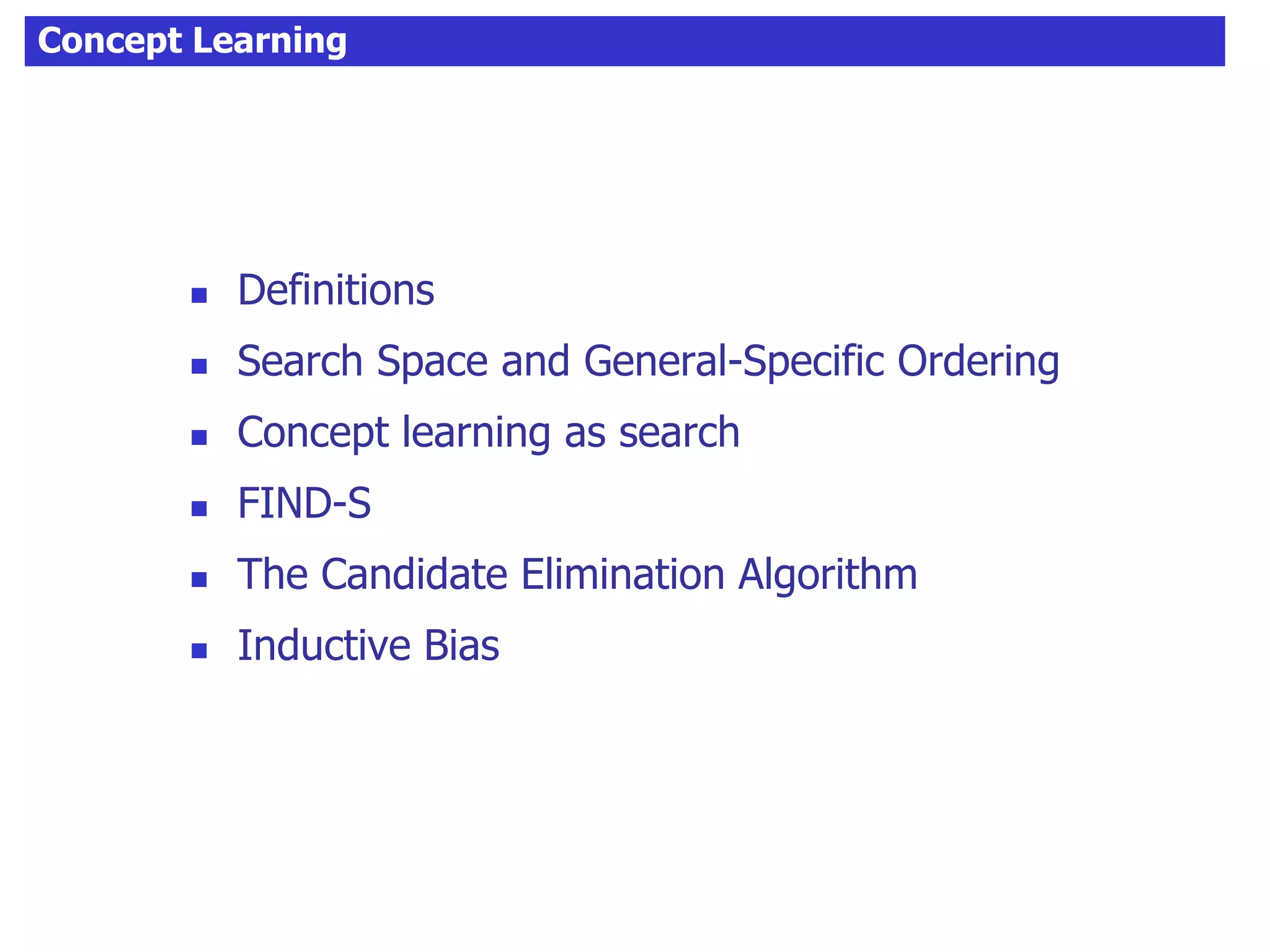 The document discusses concept learning algorithms. It introduces the problem of concept learning as inducing a function to classify examples into categories based on their attributes. The Candidate Elimination Algorithm (CEA) is presented as a method for finding all hypotheses consistent with training examples without enumerating them. CEA works by maintaining the most specific (S) and most general (G) consistent hypotheses. It updates S and G in response to positive and negative examples.