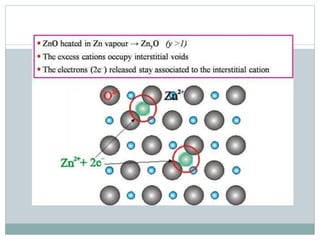 The document discusses defects in solids, categorizing them into stoichiometric and non-stoichiometric defects, which include vacancy and interstitial defects. Stoichiometric defects maintain the balance of constituent particles, while non-stoichiometric defects result from an imbalance, such as metal excess or deficiency due to cation or anionic vacancies. Examples like Frenkel and Schottky defects illustrate how these structural anomalies affect the material properties and composition of crystals.