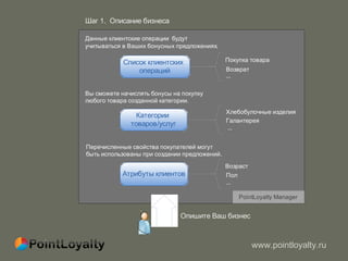 Документ описывает системы поощрения пользовательской активности, касающиеся маркетинга взаимоотношений и удержания клиентов через бонусные программы. Приведены виды поощрений, способы создания систем лояльности и использование программного обеспечения pointloyalty manager для управления данными и расчётом бонусов. Основное внимание уделяется важности адаптации систем поощрения для различных типов бизнеса, а также необходимости настройки под специфику организации.