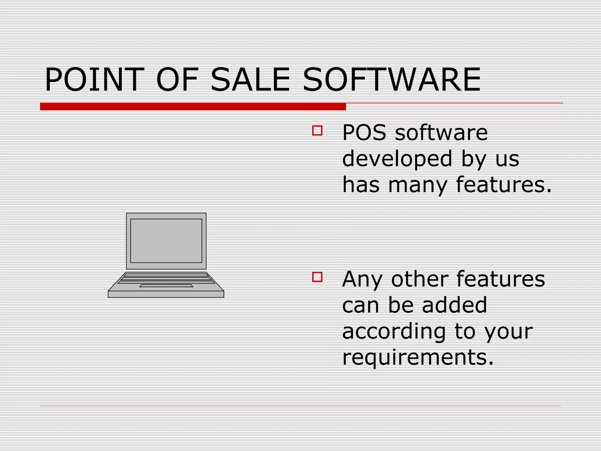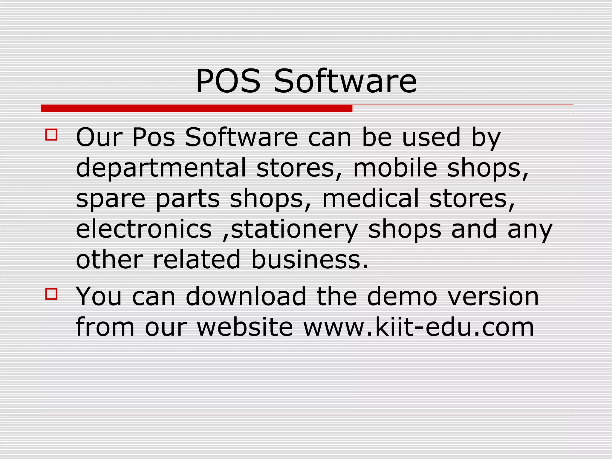 The document outlines a point of sale (POS) software with various features suitable for multiple types of businesses, including departmental stores and medical shops. It highlights the ability to customize features according to user requirements and offers a demo version available for download. Additional functionalities include barcode generation, detailed sales reports, and staff account management, with further information available on their website.