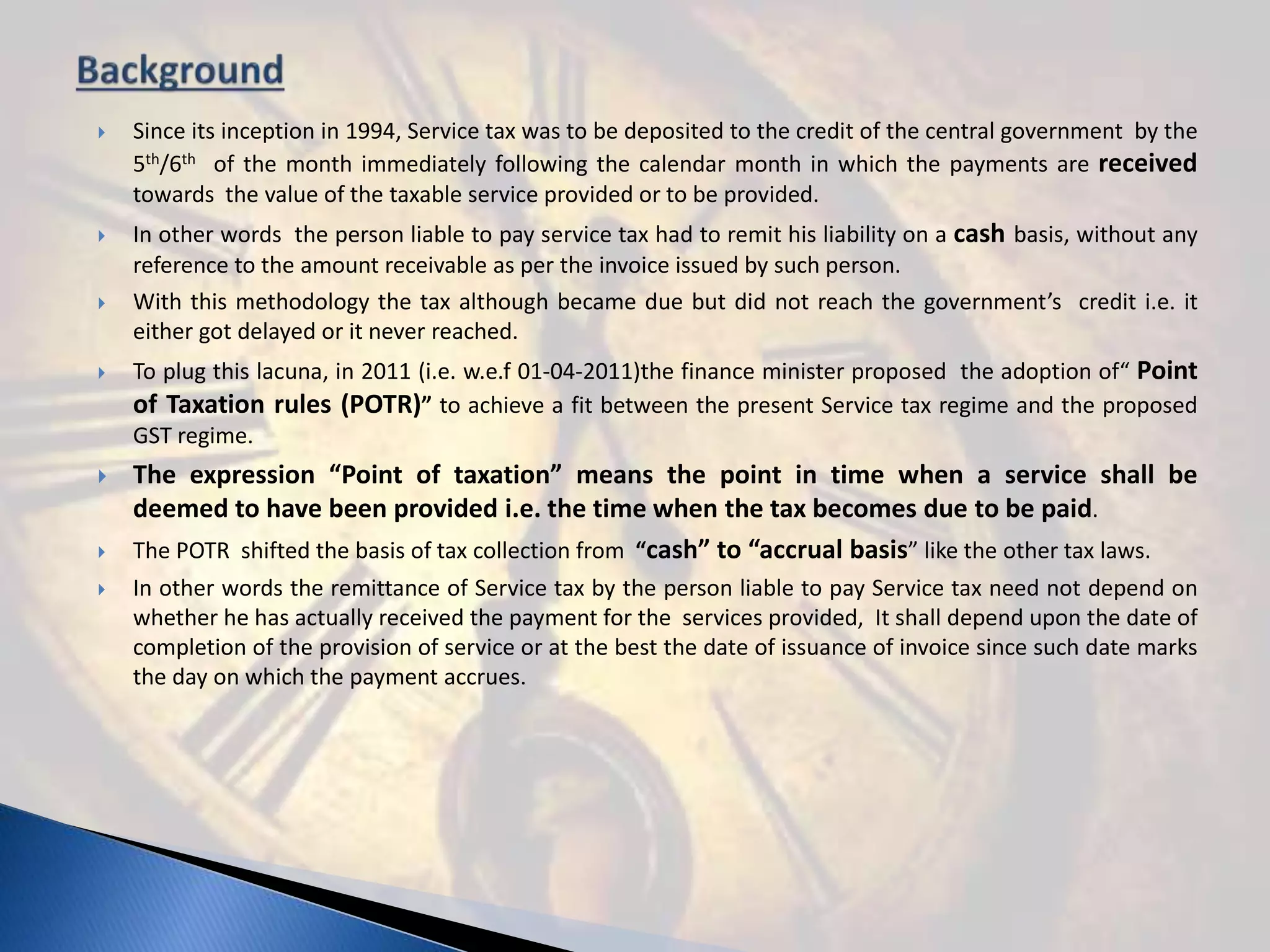 - In 2011, Point of Taxation Rules (POTR) were introduced to shift the tax collection basis from cash to accrual. Now, the service tax due date depends on the service completion date or invoice date, not payment receipt.