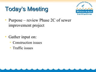 The committee met to discuss Phase 2C of the Point Place Sewer Improvements project, which involves installing a 24-inch gravity relief sewer. They reviewed two construction options for traffic handling during work and received updates on other phases of the project. The city recommended a one-way bypass detour route approved by transit and fire departments to maintain emergency vehicle access. Notifications to residents and businesses would be made through meetings, newspaper ads and signage in advance of construction starting in November 2005.