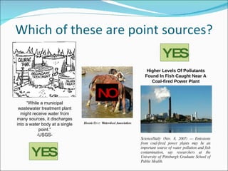 The document discusses point source water pollution and regulations. It provides background on key policies and acts related to water quality regulation, such as the Clean Water Act. It also summarizes different regulatory approaches for point sources, including command-and-control regulations and market-based mechanisms like effluent taxes and tradable permit systems. Overall, the document presents an overview of point source pollution issues and the evolution of policies in the United States to regulate industrial and municipal wastewater discharges.