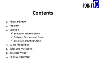 Point10 is a company focused on building products with social impact by engaging students, professionals, and experts. It aims to address issues in higher education like lack of resources, career guidance, and industry interaction. Point10's divisions work on education reforms, software development, and business consulting. It seeks to empower students and small businesses while collaborating globally to develop innovative solutions.