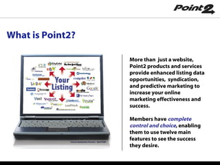 Point2 provides online marketing tools and services to over 183,000 real estate professionals in 100 countries. Their platform offers 12 main features including unlimited rich listings, syndication to over 30 partners, websites, virtual tours, neighborhood targeting, prospecting tools, predictive marketing, drip emails, blogs, and statistics. Members have control over their listings and tools to maximize online exposure and marketing effectiveness. Point2 offers various subscription levels from free standard to premium options with additional features and support.