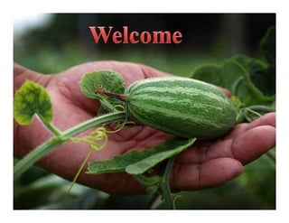 The document discusses Trichosanthus dioica, commonly known as pointed gourd or parwal, highlighting its origins in India, cultivation primarily in certain states, and its medicinal properties. The fruit is used in various culinary dishes and is known for its diuretic and cardiotonic effects, alongside benefits in managing blood sugar and cholesterol levels. It details the plant's botany, propagation methods, and various strains developed through local selection, along with optimal growing conditions and planting practices.