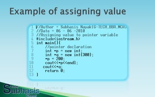 The document explains dynamic memory allocation in C++, detailing how to allocate and deallocate memory using 'new' and 'delete' operators. It provides syntax examples for creating object pointers and emphasizes the importance of matching data types between the allocated memory and the pointer. Additionally, it discusses the use of 'const' in pointer types, illustrating how it impacts the mutability of the pointer and the value it references.