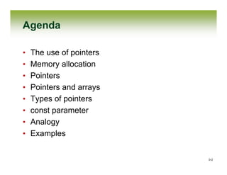 The document provides an overview of the use of pointers in programming, focusing on their role in memory allocation, data manipulation, and function interactions. It explains how pointers allow for direct access to memory addresses and facilitate passing variables between functions, enabling changes to persist across contexts. The document also discusses various pointer types, their declaration, initialization, and the significance of dereferencing in accessing and modifying values in memory.