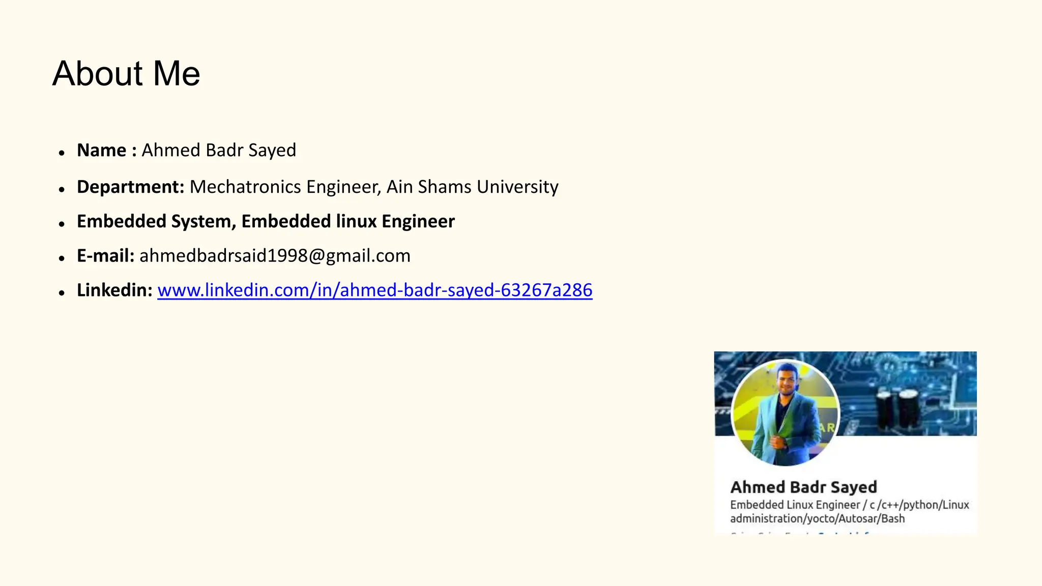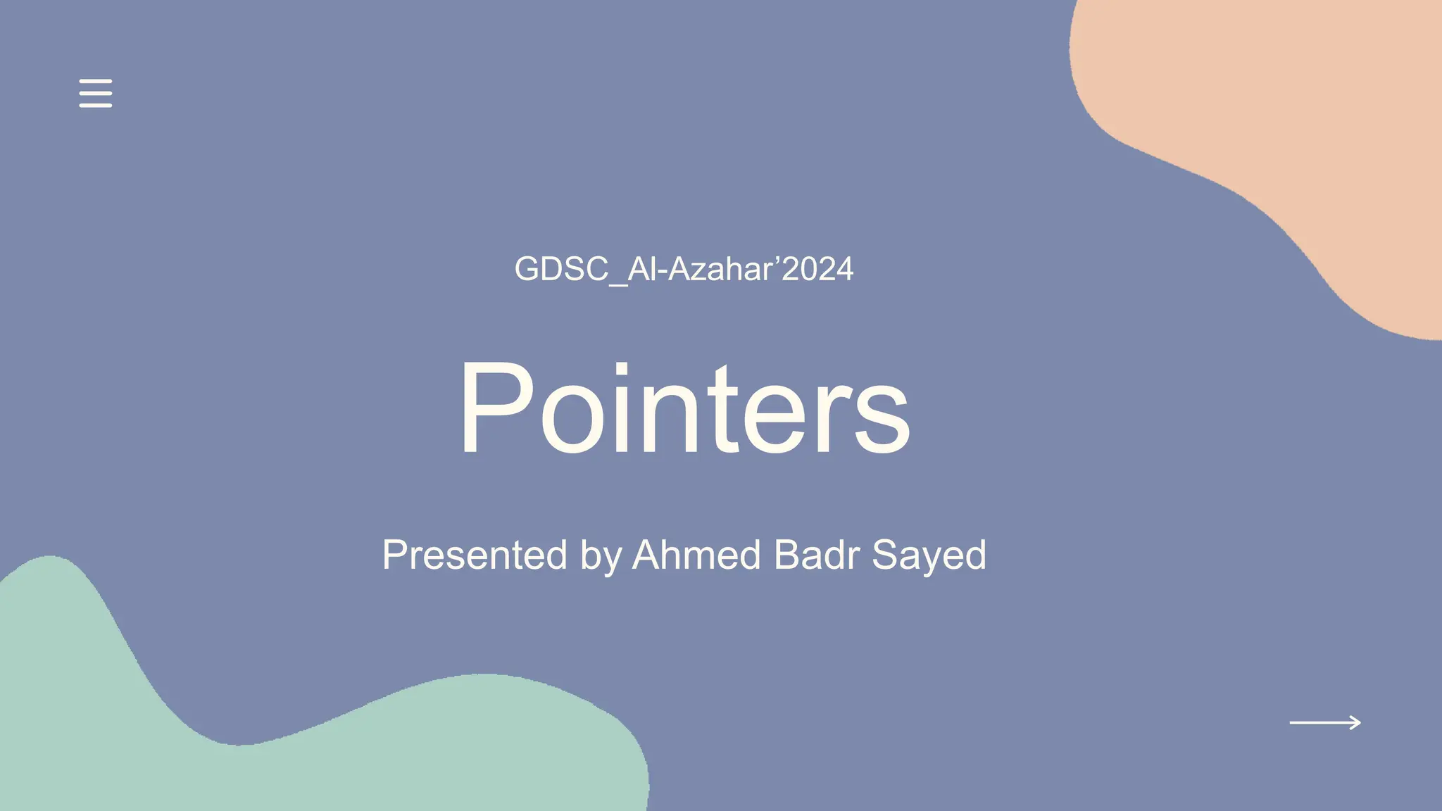 Ahmed Badr Sayed is a mechatronics engineer at Ain Shams University who specializes in embedded systems and embedded Linux. His presentation covers pointers in C, including: (1) declaring and initializing pointers and why they are needed; (2) the difference between passing by value vs. reference; (3) pointer operations like incrementing and subtracting; (4) passing arrays to functions; (5) multiple indirection using pointer to pointer; (6) pointers to structures and functions. He also discusses void pointers, dangling pointers, wild pointers, and NULL pointers. The presentation provides an overview of pointers for programmers to better understand and work with them.