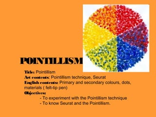 Pointillism is a painting technique using small dots or points of primary colors that blend together when viewed from a distance, pioneered by Georges Seurat in the late 19th century. The document outlines the Pointillism technique using felt-tip pens on canvas without color mixing, discusses Seurat's background and most famous work "Sunday Afternoon on the Island of La Grande Jatte," and shows examples of student artworks applying the Pointillism style.