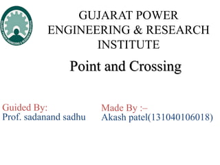 Points and crossings are railroad track components that allow trains to be diverted from one track to another. A point, or switch, is a movable section of rail that can be aligned to direct trains to the left or right. A crossing is a section of overlapping rails that allows trains to pass through an intersection. Together, points and crossings make up a turnout, which consists of a stock rail, tongue rail, heel block, and other parts to smoothly guide trains between tracks in either a left-hand or right-hand configuration.