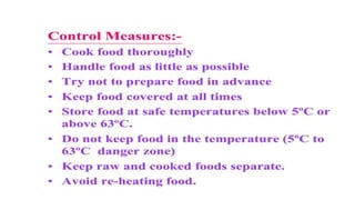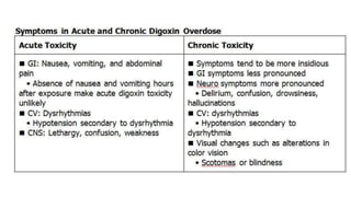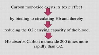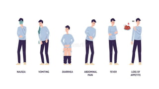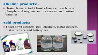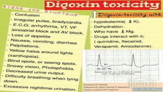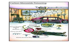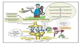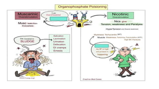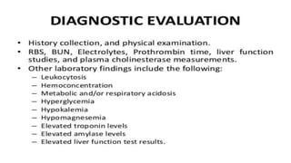 Poisoning represents harmful effects from accidental or intentional exposure to toxic substances. The main types are ingestion, inhalation, injection and absorption. Poisoning may cause local or systemic effects immediately or delayed. Causes include chemicals, household products, pesticides, therapeutic drugs, and toxic plants/animals. Signs include vomiting, diarrhea, difficulty breathing and skin rashes. Danger signs require urgent treatment like lack of breathing. Investigations include toxicology analysis and organ function tests. Treatment aims to maintain vital signs, decontaminate, enhance elimination and relieve symptoms. Management depends on specific poison but may include decontamination procedures, antidotes and supportive care.
