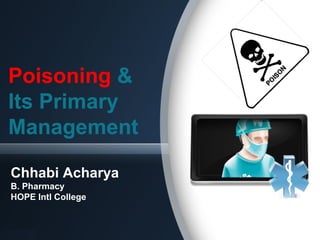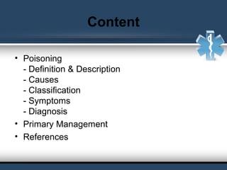 This document provides an overview of poisoning, including its definition, causes, classification, symptoms, diagnosis, and primary management. It discusses how poisoning occurs when substances interfere with normal body functions after being swallowed, inhaled, or absorbed. Poisonings are commonly caused by accidental ingestion in children and the elderly, as well as suicide attempts and drug overdoses. Poisons are classified into categories like plant, food, household chemicals, pharmaceuticals, venom, and other toxins. Symptoms vary depending on the specific poison. Primary management involves identifying the poison, inducing vomiting if swallowed, protecting from further harm, and seeking immediate medical help.