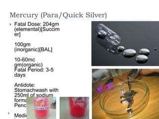 This document summarizes information on various poisons, including arsenic, mercury, copper sulfate, lead acetate, aluminium phosphide, aconite, nicotine, digitalis, croton tiglium, ricin, abrus precatorius, semecarpus anacardium, datura, opium, cannabis indica, nux vomica, and alcohol. For each poison, it provides the fatal dose, fatal period, antidotes, and potential medicolegal importance. The document serves as a reference for poison identification and treatment.