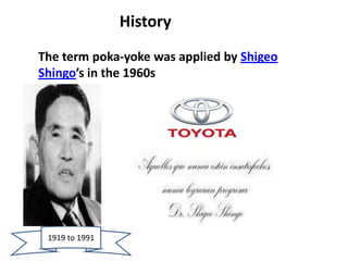 Poka-yoke is a Japanese term that means "mistake-proofing" and refers to mechanisms in manufacturing processes that help operators avoid errors. Its purpose is to eliminate defects by preventing, correcting, or drawing attention to human mistakes. Poka-yoke was developed by Shigeo Shingo at Toyota to achieve "zero defects" through fail-safe mechanisms. Examples include lifts that prevent overloading and include alarms if weight limits are exceeded. Implementing poka-yoke helps improve quality, productivity, and efficiency by reducing errors, rework, and waste in manufacturing processes.