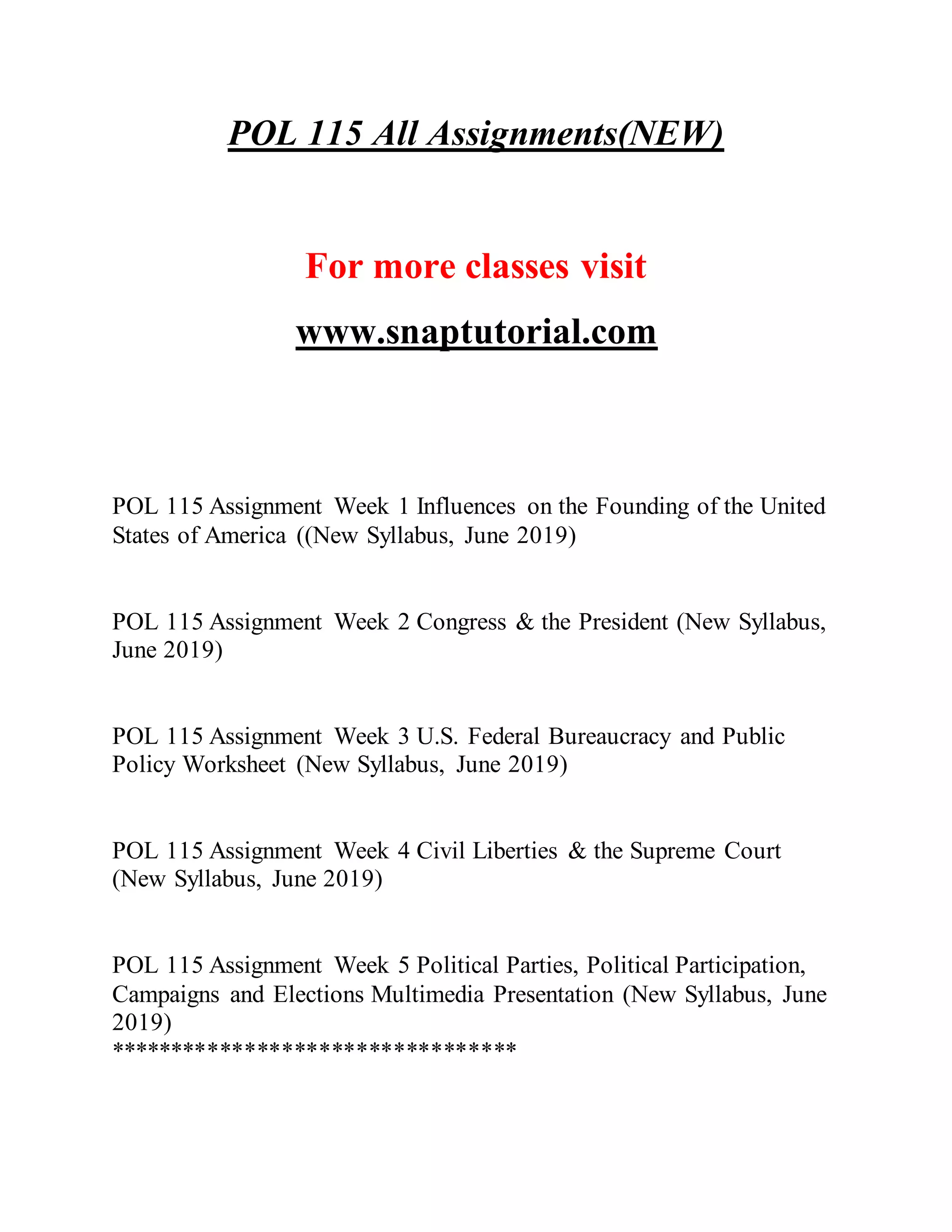 The document outlines the assignments and topics for a POL 115 course, detailing weekly assignments that cover the founding influences of the U.S., the roles of Congress and the President, civil liberties, civil rights, and public policy. Each week includes specific tasks related to these topics, ranging from essays and worksheets to multimedia presentations. Students are expected to complete these assignments while adhering to APA citation guidelines and using provided materials for reference.