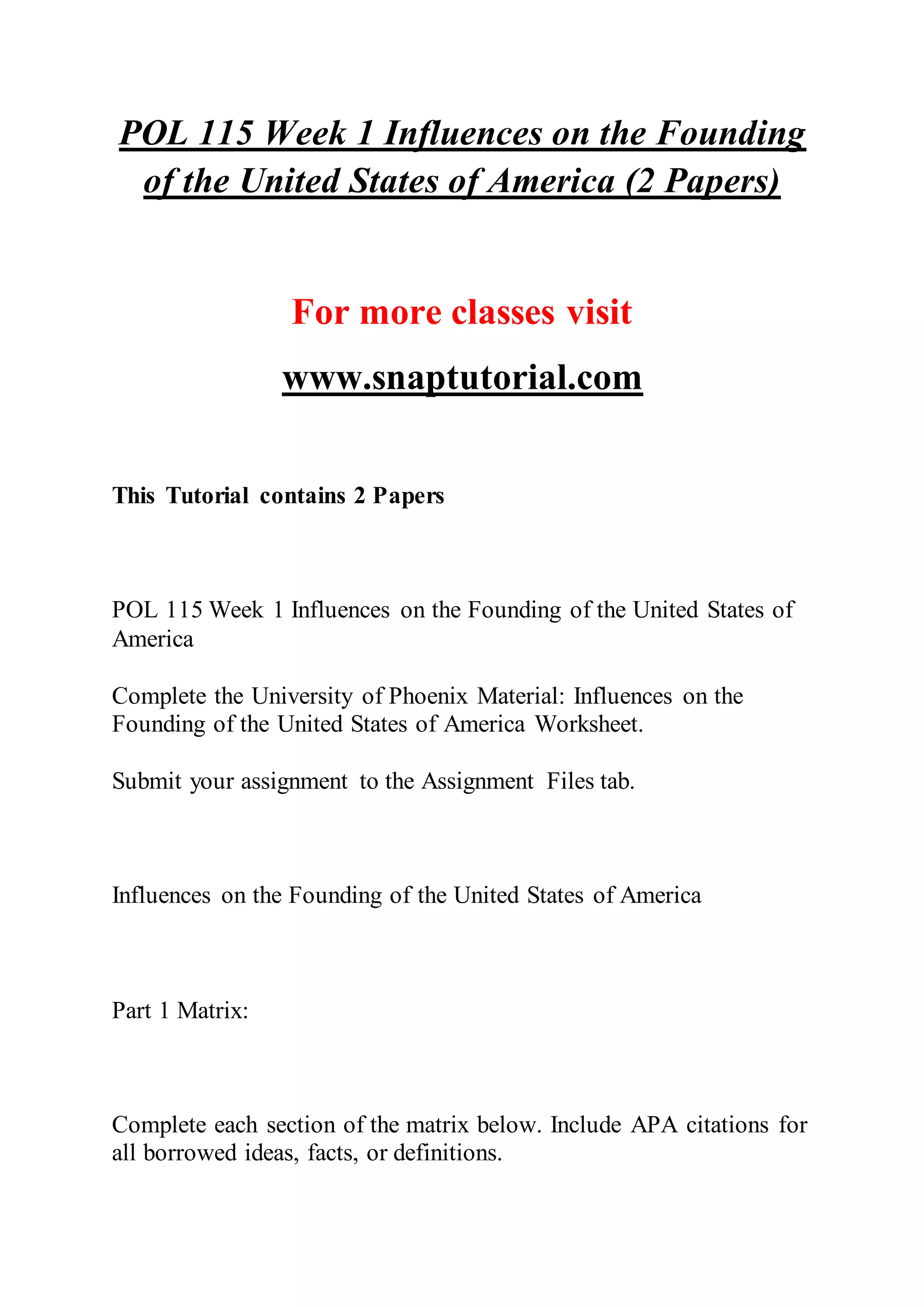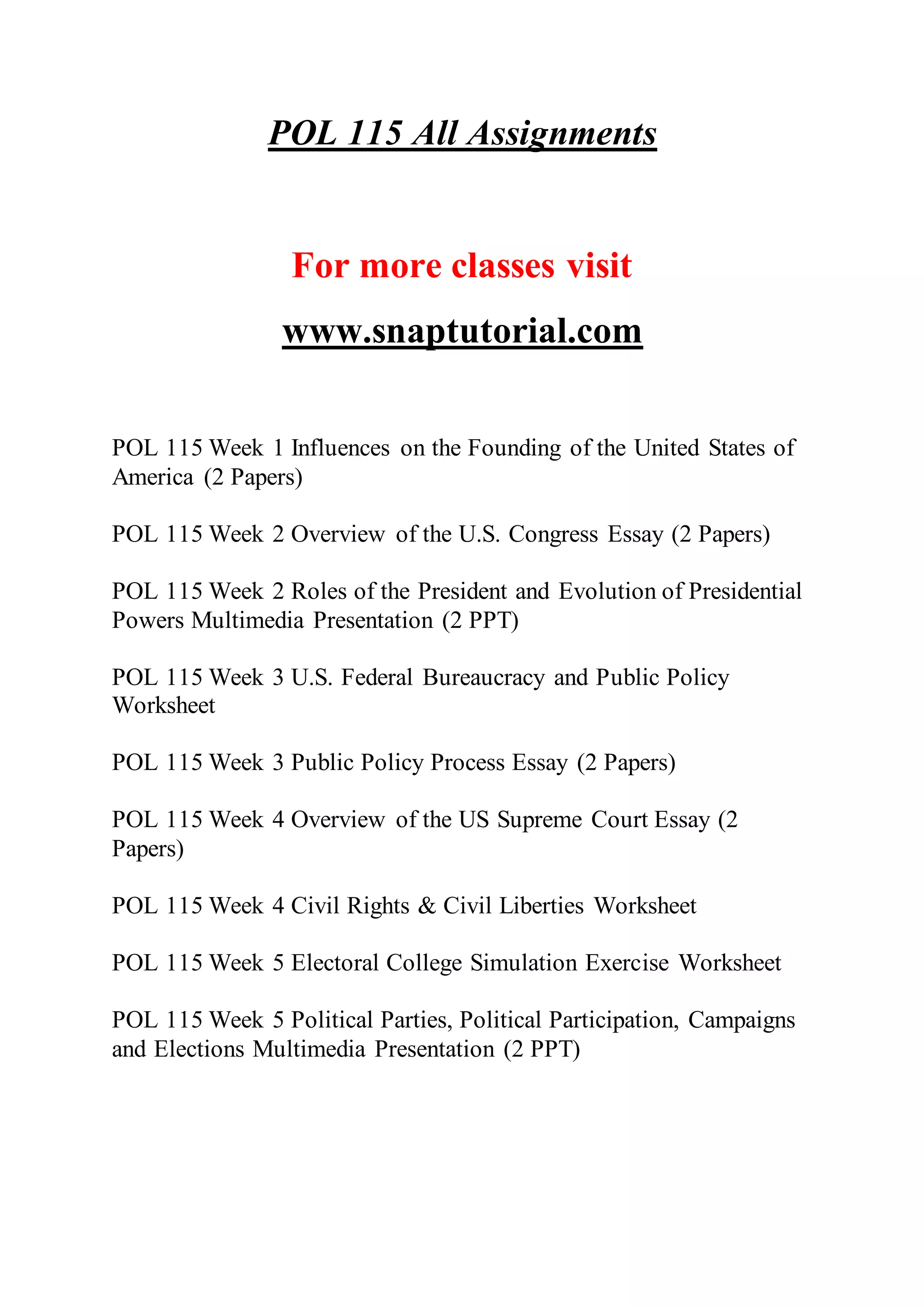 The document outlines various assignments and tutorials for a POL 115 course, covering topics related to the U.S. founding principles, Congress, presidential powers, public policy, civil rights, the Supreme Court, the electoral college, and political participation. Each section includes specific essay and presentation instructions that require students to engage with historical documents, analyze political processes, and explore the role of government institutions. The educational materials emphasize understanding American political culture, institutions, and the complexities of democratic engagement.