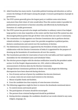 The document discusses the evolution and characteristics of democracy, focusing on the electoral process. It highlights the importance of elections, the distinction between direct and indirect democracy, and the unique features of the Indian electoral system, such as universal adult franchise and the first-past-the-post system. Additionally, it addresses challenges in the electoral process and suggests measures to enhance democratic participation.