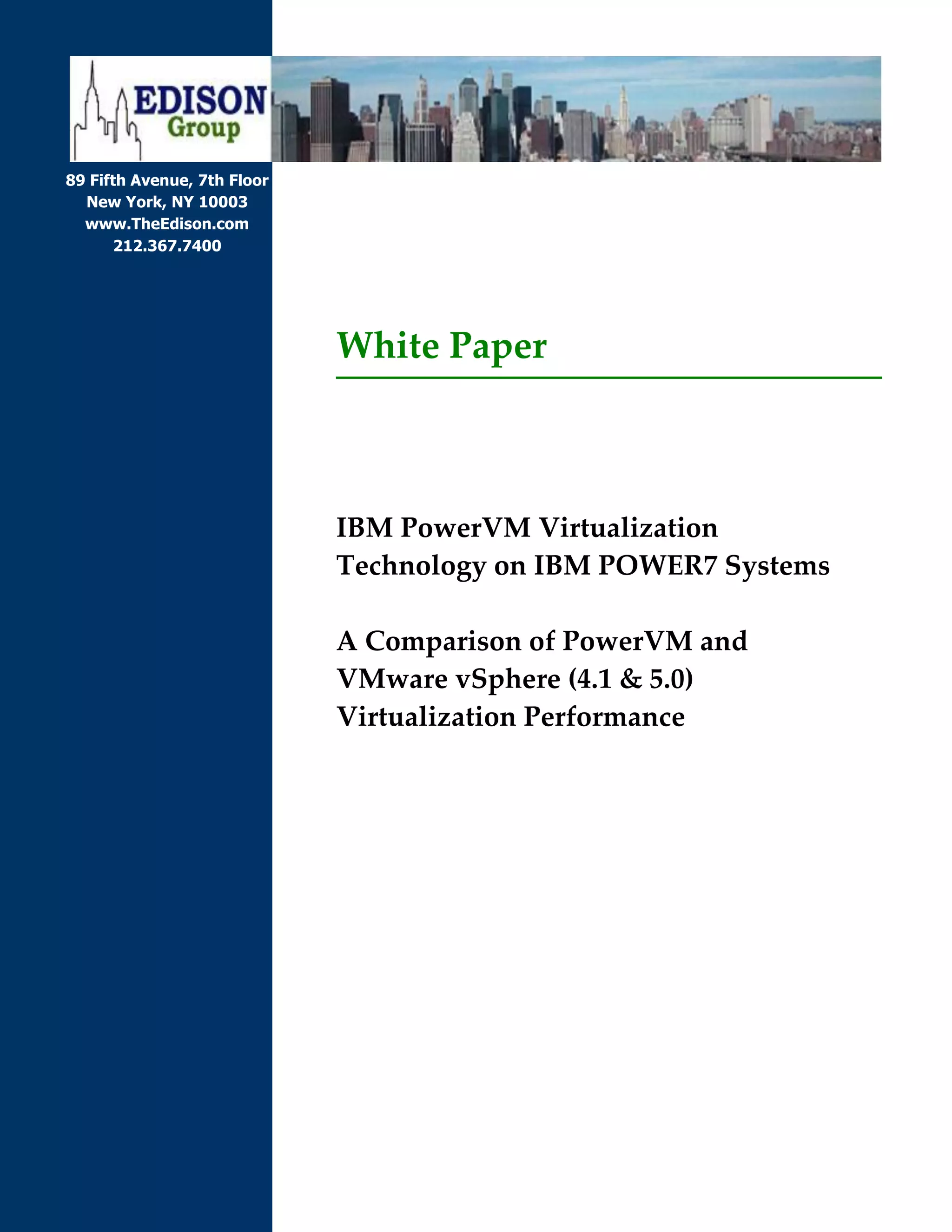 This document compares the performance of IBM's PowerVM virtualization technology on POWER7 systems against VMware vSphere 4.1 update 1 on Intel x86 platforms using two industry standard benchmarks: AIM7 and TPoX. The AIM7 benchmark showed PowerVM delivering up to 115% better performance than vSphere at a consolidation ratio of 32 VMs to cores. PowerVM also demonstrated more linear scaling than vSphere across VM configurations from 1 to 32 VMs. Additional tests configuring vSphere VMs with 2 vCPUs each to better utilize Intel cores still showed PowerVM significantly outperforming vSphere.
