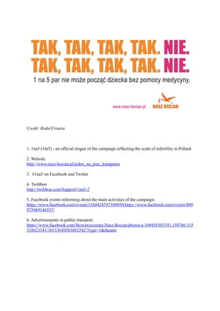 The document summarizes events from the first National Infertility Awareness Week in Poland from June 6-12, 2016. Key events included an online and social media campaign with the slogan "1na5" to reflect the scale of infertility in Poland. There was a "March of Empty Strollers" in protest of proposed amendments to infertility treatment laws, and a conference held in the Polish Parliament with ESHRE representatives to prevent the amendments. Throughout the week numerous memes and social media posts spread awareness, while flyers, t-shirts, and media coverage helped promote the issues around infertility.