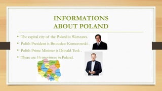 Poland is a country located in central Europe. The capital city is Warsaw and the president is Bronislaw Komorowski. There are 16 provinces and various geographic features like lakes, mountains, and the Baltic Sea. Some famous Polish people include Marie Curie who discovered polonium and radium, composer Frederic Chopin, mathematician Nicolaus Copernicus who formulated the heliocentric model of the universe, and writer Henryk Sienkiewicz who won the Nobel Prize. The summary highlights key facts about Poland's capital, leadership, geography, famous citizens, and monuments like Wawel Royal Castle and the historic crane in Gdansk.