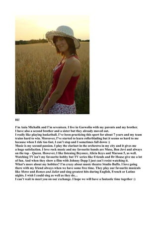 Ania introduces herself as a 17-year-old high school student from Mietne, Poland. She lives with her two older brothers and two younger sisters. Ania enjoys singing in her school choir, playing guitar, listening to music, playing basketball and volleyball, skiing, trekking, and watching comedies, action films, and historical films. Her favorite subjects in school are math and physics because she values logical thinking. She also speaks English and has some knowledge of Russian and German.