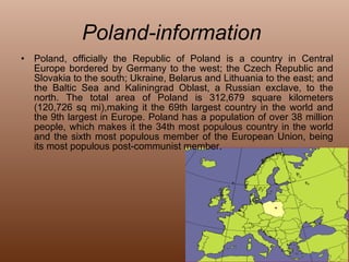 Poland is a country located in Central Europe bordered by Germany, Czech Republic, Slovakia, Ukraine, Belarus and Lithuania. It has a population of over 38 million people and its total area is 312,679 square kilometers. The longest rivers in Poland are the Vistula River and Oder River. Poland has a temperate climate that is oceanic in the north and west and becomes more continental in the south and east. Some of Poland's most famous people include scientist Marie Curie and Pope John Paul II.