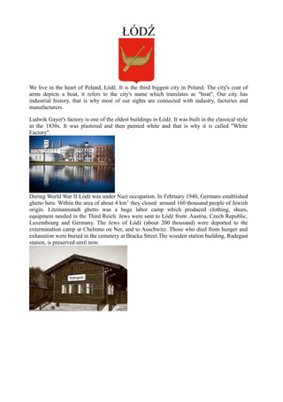 Poland is a large country in central Europe that has been a member of the European Union since 2004. Its capital and largest city is Warsaw, which contains many historic sights. Poland has a rich history and managed to preserve much of its cultural heritage despite extensive damage during World War II. Other popular cities include Kraków, Wrocław, Poznań, Gdańsk, and Łódź. Łódź is Poland's third largest city located in the center of the country. It has an industrial history reflected in many of its architectural sights like the White Factory. During World War II, Łódź was under Nazi occupation and contained a large ghetto and labor