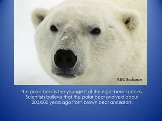 The polar bear is a large bear species native to Arctic regions. It evolved from brown bear ancestors around 200,000 years ago. Polar bears are well adapted to survive in Arctic conditions, with thick fur, fat layers, and large paws. They primarily hunt seals from the sea ice. There are estimated to be 20,000 to 25,000 polar bears total, found throughout the Arctic in Russia, Alaska, Canada, Greenland, and Norway. However, their sea ice habitat is decreasing due to climate change, which poses the greatest threat to polar bear survival.
