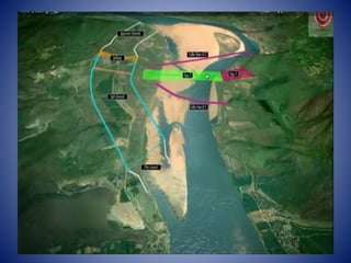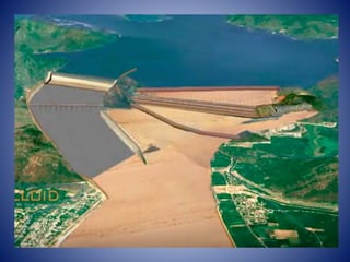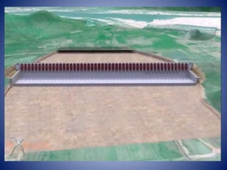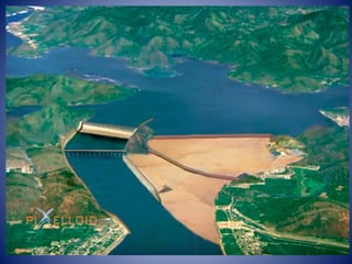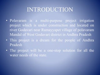 The document summarizes the key components and benefits of the Polavaram Project, a multi-purpose irrigation project under construction in Andhra Pradesh. The main components include a spillway with radial gates, earth-cum-rock fill dam, two coffer dams, and a hydroelectric power house. The dam will be able to withstand 50 lakh cusecs of water flow. Benefits include supplying 80 TMC of water to the Krishna Delta region, utilizing all of Andhra Pradesh's Krishna river water allocation for the Rayalaseema region, and providing 960 megawatts of hydroelectric power. Completion of the project is expected to satisfy Andhra Pradesh's water needs.