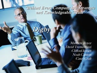Team Digby creates sensor products and aims to satisfy customers better than competitors in areas like accessibility, awareness, price, performance, size, and reliability. Their mission is to become the number one sensor company chosen worldwide. Each member leads a department - Royce leads R&D, Jensen leads Marketing, Cannon leads Production, Trementozzi leads Finance, Craft leads HR. They struggled early on but adapted their strategy and increased automation, employee satisfaction, and quality to become highly successful.