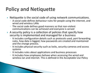 Netiquette and security policies define rules for appropriate online behavior and securing wireless networks. A security policy outlines how networks are configured and managed, including protocols, passwords, physical security, and acceptable use. Securing wireless networks requires a defense-in-depth strategy with multiple overlapping security measures, such as reducing the wireless signal range, disabling SSID broadcasts, implementing MAC address filtering, using the strongest encryption standard, creating an acceptable use policy, and monitoring the network for threats.