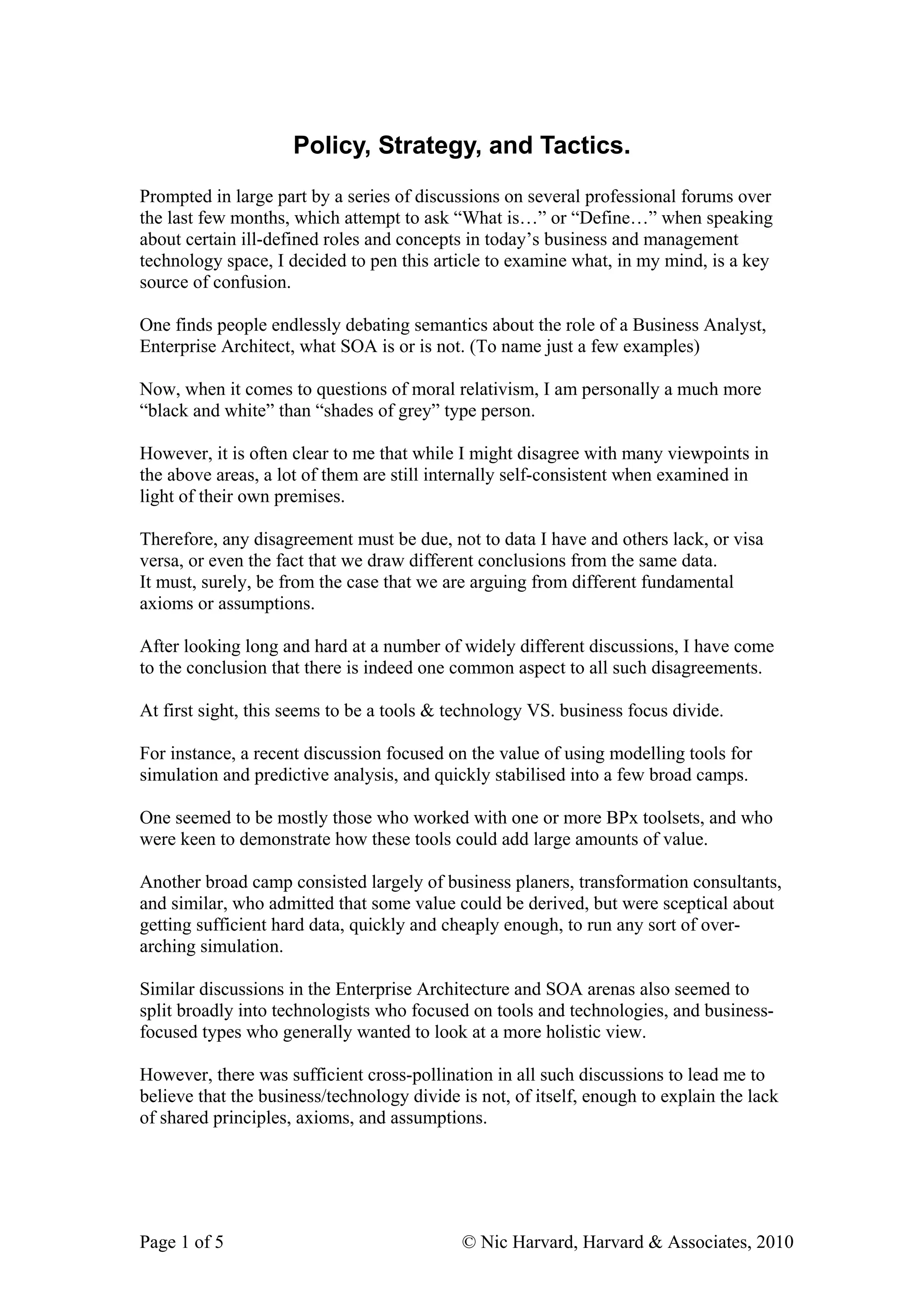 The document discusses the importance of distinguishing between policy, strategy, and tactics. It uses a military example to define these concepts: policy is set at the highest level and defines broad goals; strategy is developed by commanders to execute policy; and tactics are the specific plans and maneuvers used at lower levels to achieve strategy. It argues that a lack of clarity between these concepts in companies leads to disagreements, as people may be operating from different assumptions about their roles and responsibilities. Specifically, those focused on tactics may be criticized for strategic efforts, or vice versa.