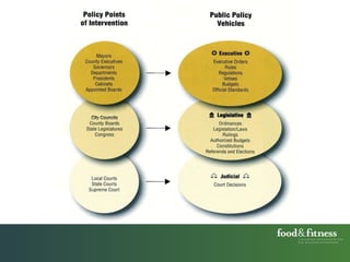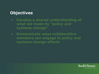 This document discusses policy and systems change. It defines policy as rules that govern organizations and public funds allocated by government. Policy change occurs through new or amended policies. Systems are groups of interrelated elements that form a unified whole, like a food or transportation system. Systems change happens when elements in a system substantially change, altering their relationships and overall structure. Policy change is a key driver of systems change. The document provides examples of public policy changes in different jurisdictions that helped achieve systems changes, like Portland's policies that supported a three-fold increase in bicycling.