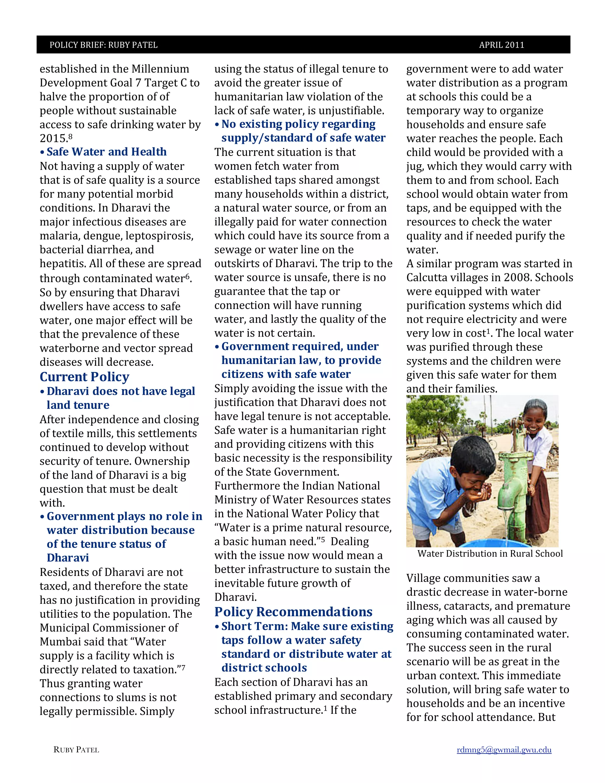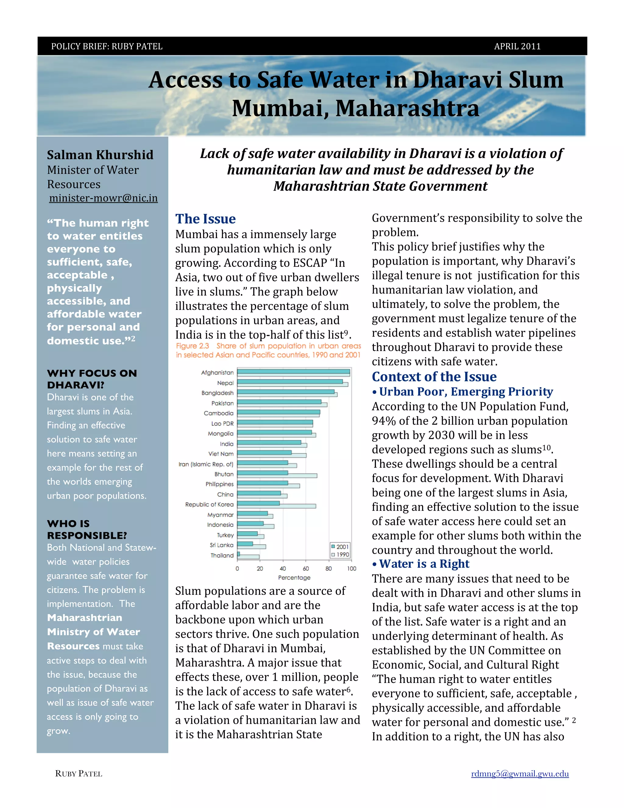Dharavi is one of the largest slums in Asia, home to over 1 million residents in just 2.1 square kilometers. It faces a major issue with access to safe drinking water, as many residents must purchase water from informal and unregulated sources that are susceptible to contamination. Both the national and state governments are responsible for ensuring access to safe water for all citizens according to policy, but implementation has been lacking, especially in Dharavi due to its large population and lack of formal land tenure, posing health risks that must be addressed.