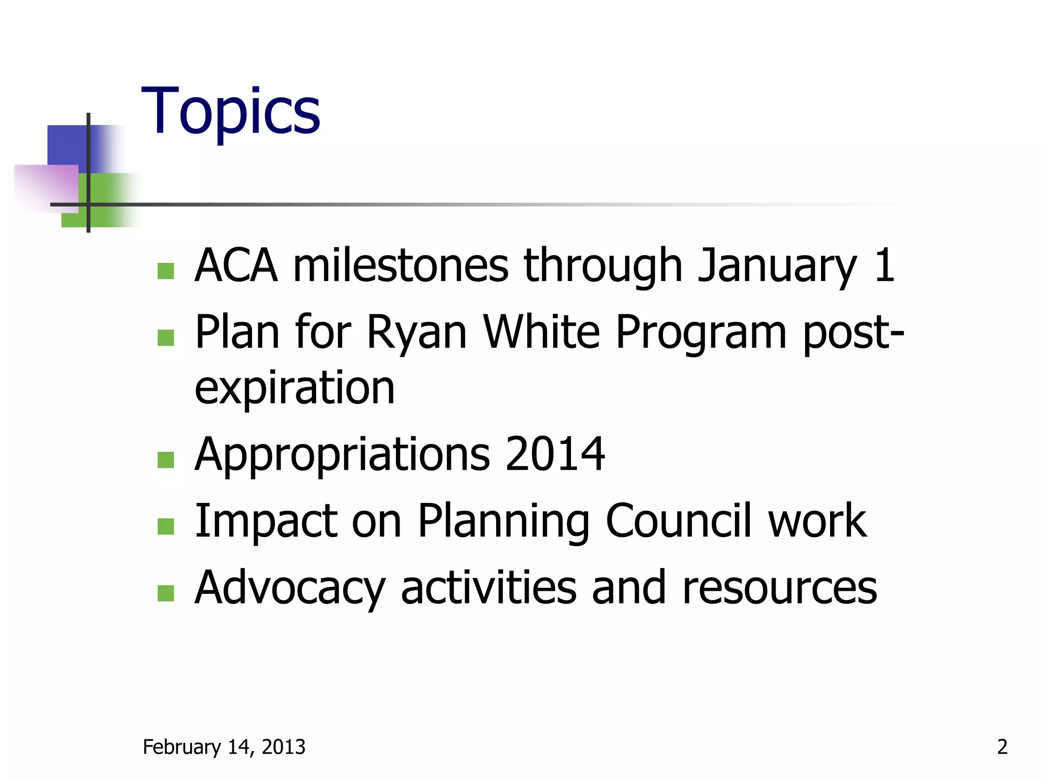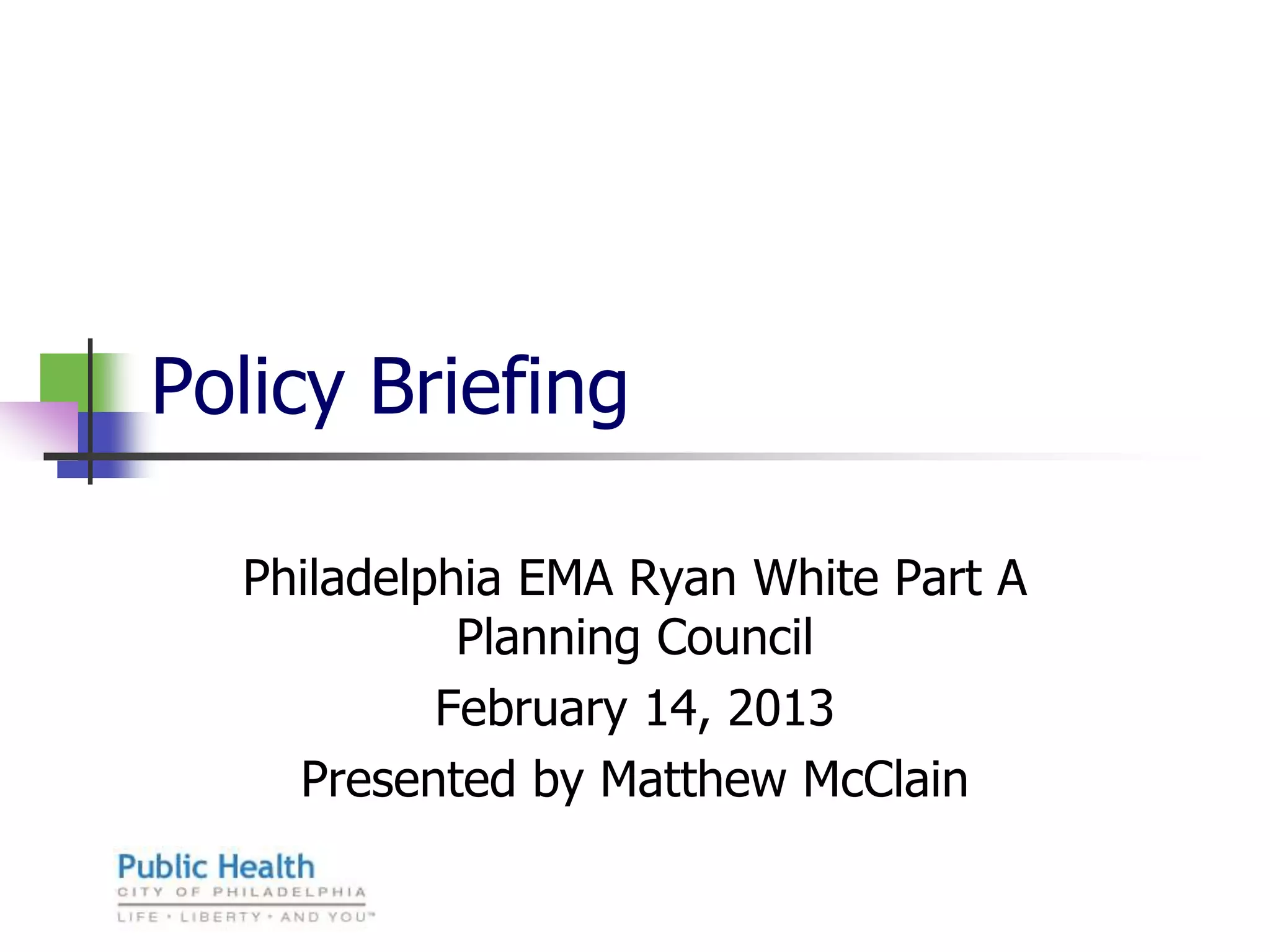 This document summarizes key points from a policy briefing about the Affordable Care Act and Ryan White program. It discusses ACA milestones including Medicaid expansion and health insurance exchanges. It notes that some states like Pennsylvania may not expand Medicaid. The briefing also covers the potential impacts of sequestration cuts and upcoming advocacy events regarding appropriations for HIV/AIDS programs.